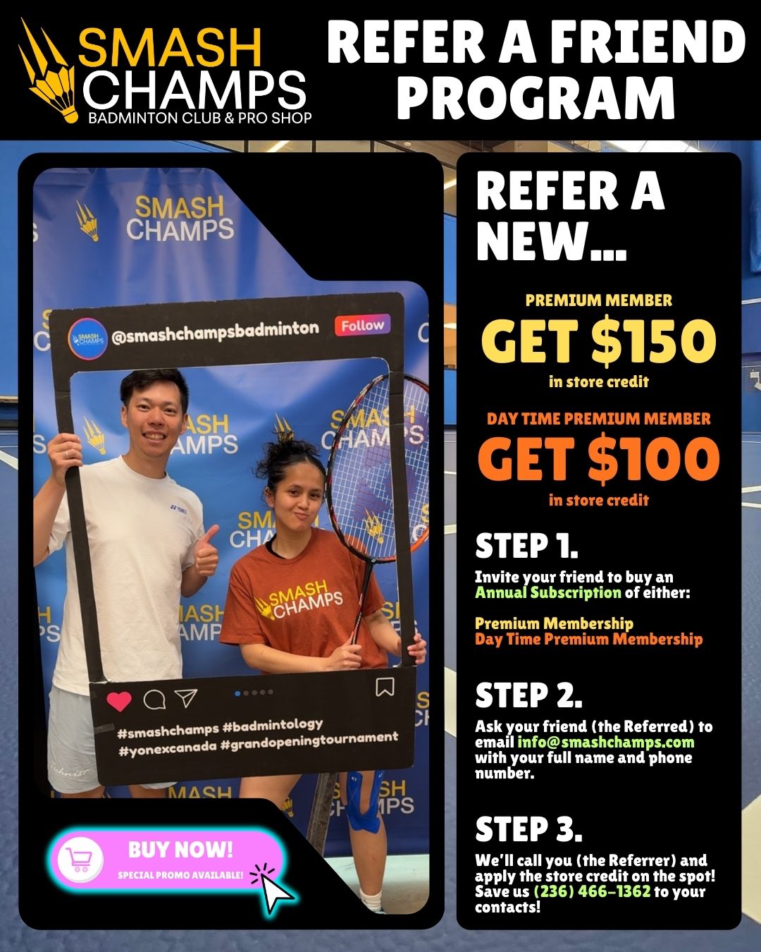 - This page contains information about various programs at Smash Champs. The Club does not guarantee that the information contained within this page to be accurate, complete, or current. The club is not responsible for any erroneous purchases as a result of the contents of this page. If you have any questions or concerns relating to a promotion(s) at Smash Champs, please give us a call at (236) 466-1362 or email us at [email protected].